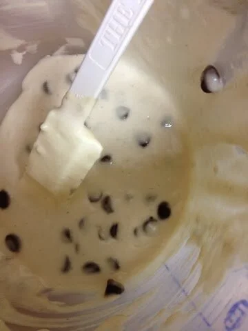 Sometimes I make pancakes from scratch. But I'll be honest.. most days, especially school and work days, I start with a (just add water) mix. I don't measure anything (This drives my sister crazy. When she asks for measurements, I usually just shrug and say, "However much.") I scoop some mix into a bowl, add water and whisk, adding more water until the consistency seems right, and then I add the magic. I like to add a little extra love to my pancakes, in the form of vanilla and almond extracts. This is the base of pretty much every version of pancakes I make... then I stir in the final ingredient, which today was chocolate chips, but could also be blueberries, bananas, etc.