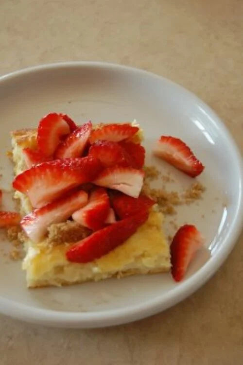 We usually eat this with brown sugar, strawberries, and sometimes sour cream. You can also slice apples and lay them on top of the batter before baking, and sprinkle with cinnamon and sugar.